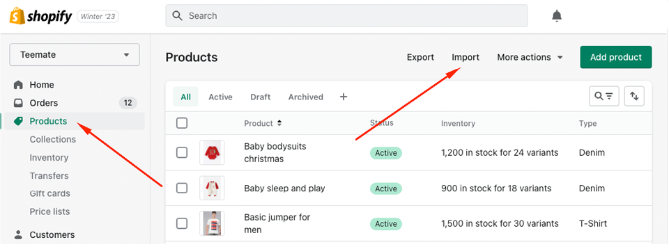 Importing products into your Shopify store using a comma-separated values (CSV) file is useful when you switch to Shopify from another platform or when you want to make many changes to your products or inventory. When you import products, the data is converted from the CSV file into products and you can select whether you want to publish your new products to all sales channels or only to your online store.