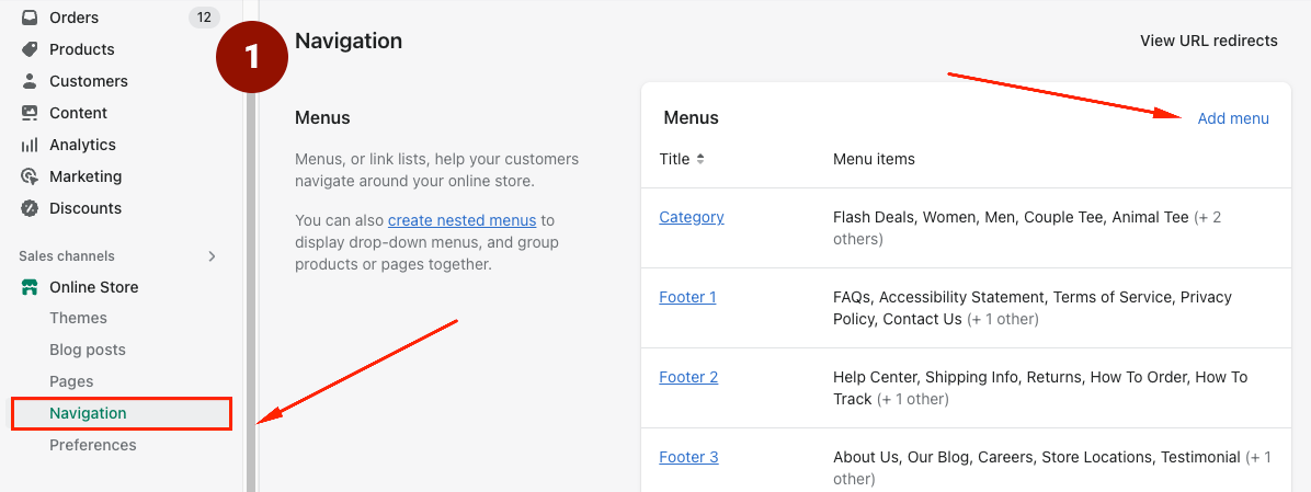 1. To configure the menu on the header, you must first create a menu. From Your Shopify Admin > Online Store > Navigation > Add Menu. (Please see photo #1).