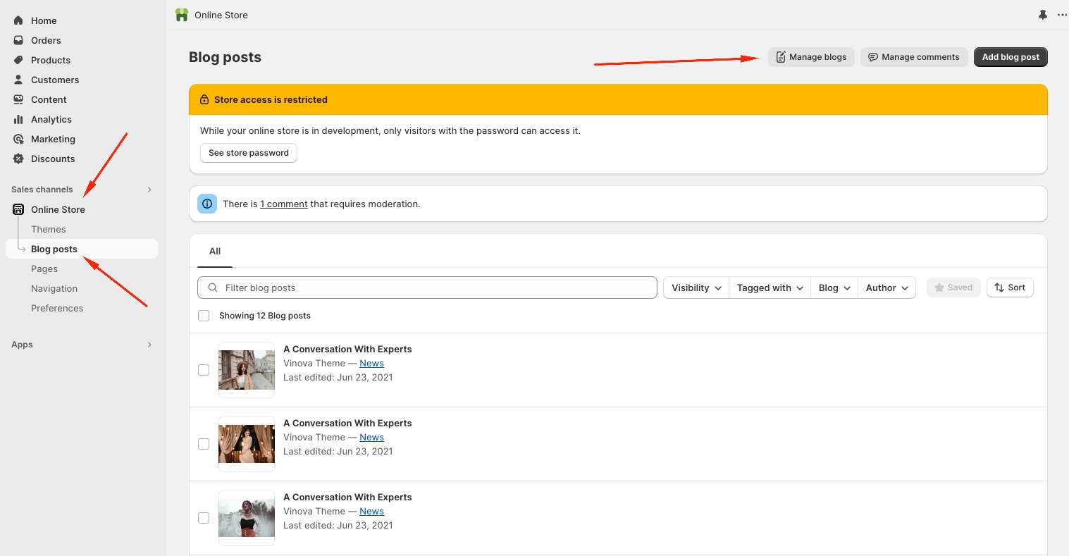 From your Shopify admin, go to "Online Store" -> "Blog Posts" -> Click the "Manage blogs" button.