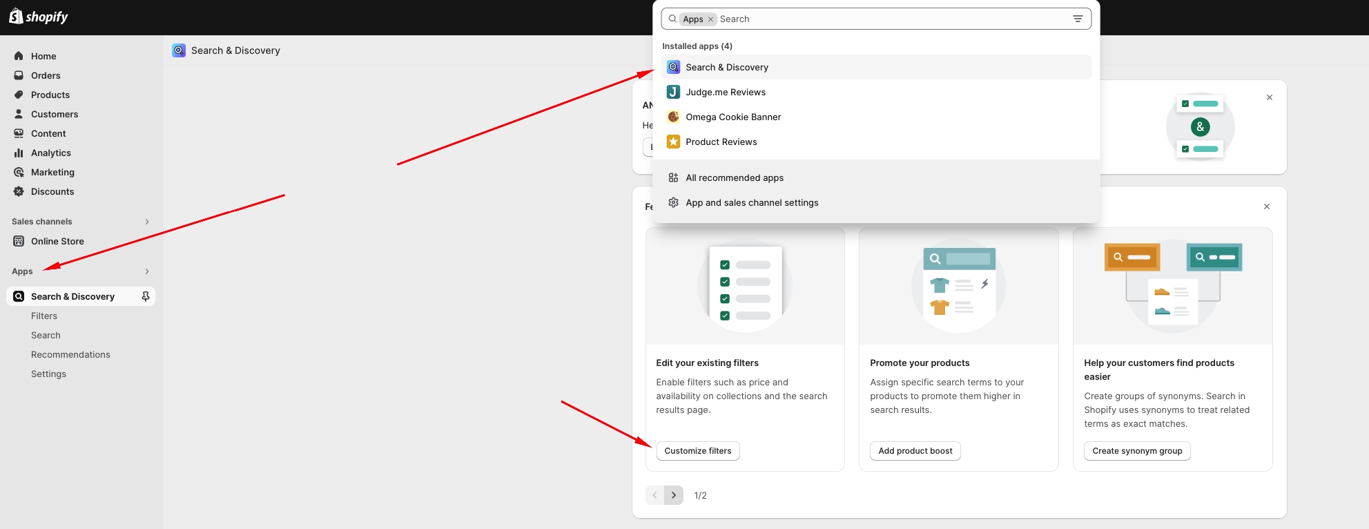 After installing the app, please click on "Apps" and select the "Search & Discovery" application to customize the filter as you like.