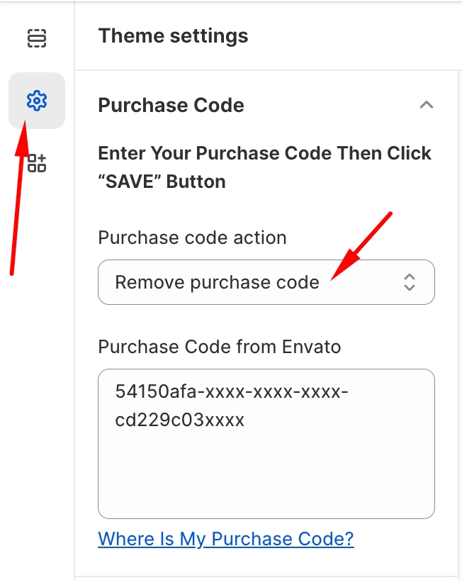 From Theme Settings, go to the Purchase Code tab > Purchase code action > Remove Purchase code
