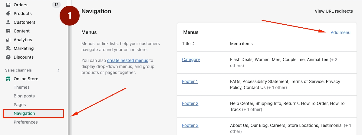 To configure the menu on the header, you must first create a menu. From Your Shopify Admin > Online Store > Navigation > Add Menu. (Please see photo #1).