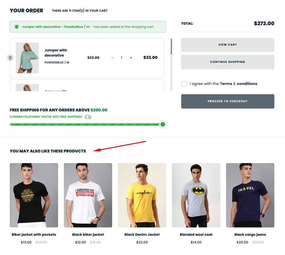 Cross-sell, Upsell, and product suggestions encourage your customers to add more items to their cart, increasing your AOV & eventually, your profits. This collection appears in the Cart popup and Cart page.