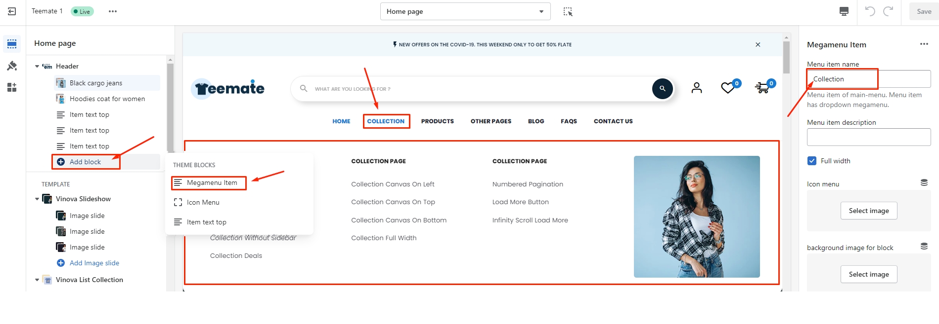 In the Mega menu block, there are items: menu, image, list collection, and product. You can customize it however you want.