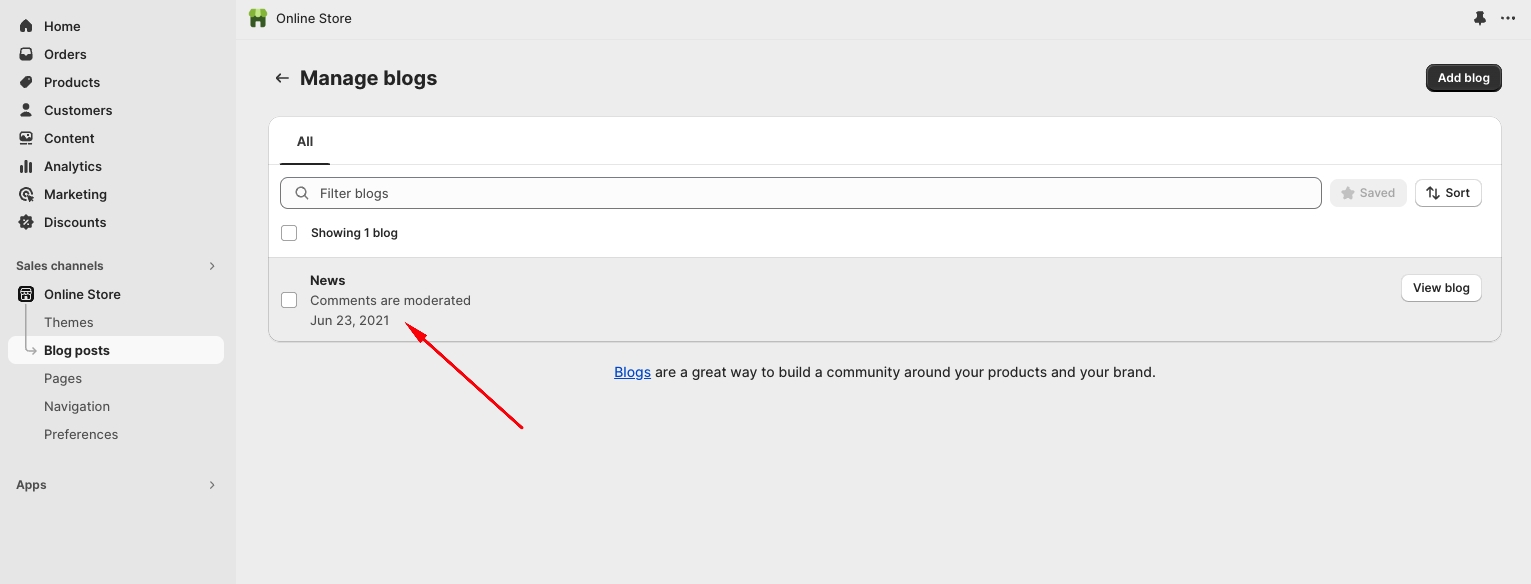 From your Shopify admin, go to "Online Store" -> "Blog Posts" -> Click the "Manage blogs" button.