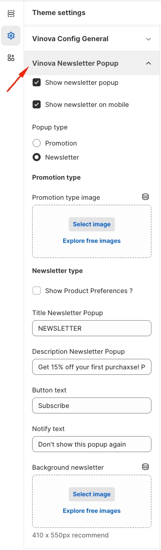 There are two types of popups: Promotion and Newsletter. If you choose Promotion, the popup is a banner image with an added link to take customers to the promotion collection.
